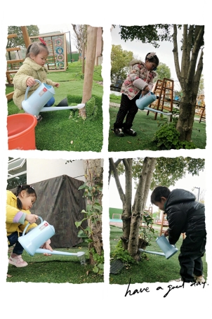 看,小一班孩子拿着洒水壶,正在给幼儿园里的绿植浇水,真是温馨又愉快的场景。